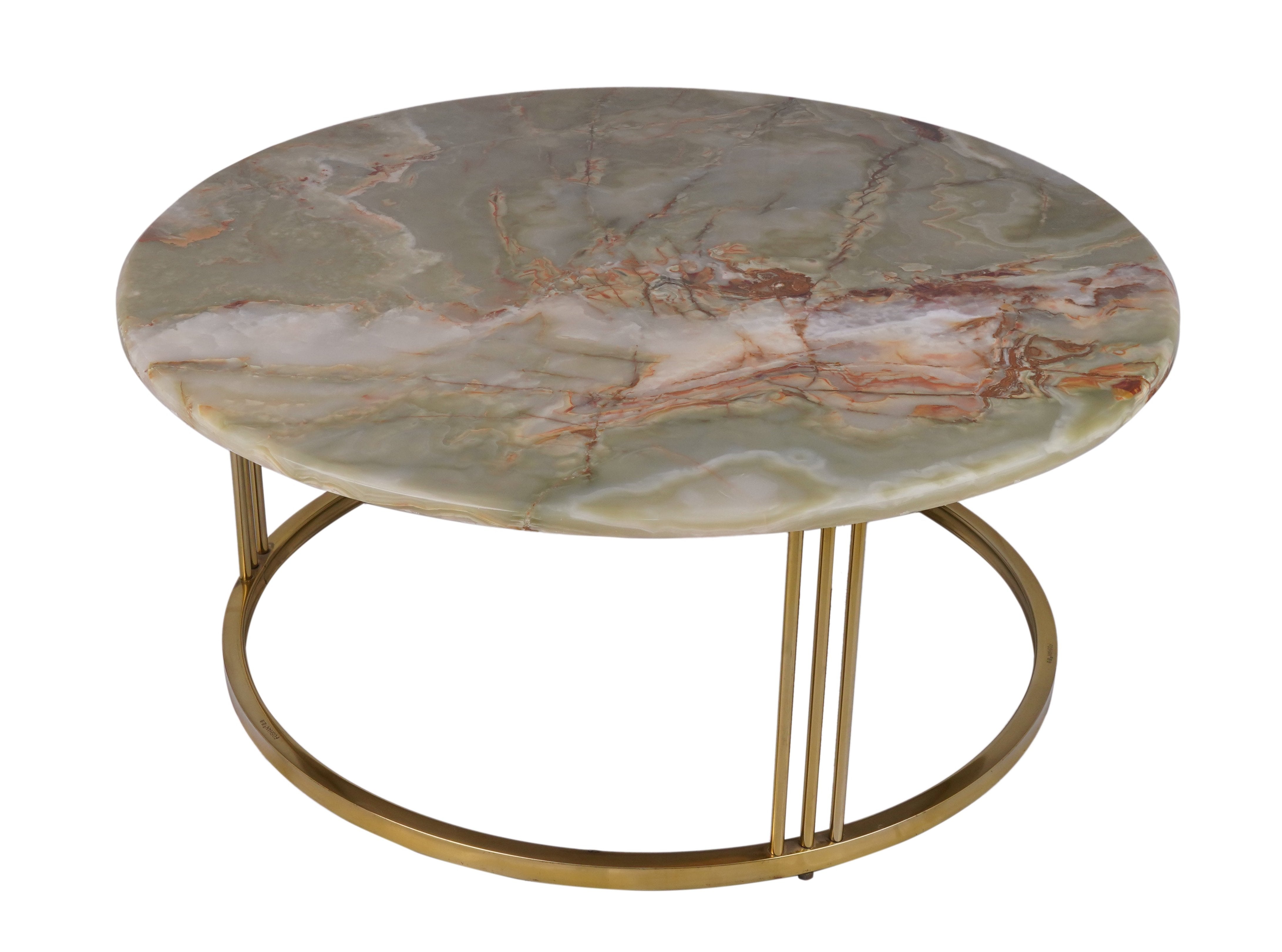 Crafted from premium Green Onyx, this table showcases the unique veining and natural beauty of the stone, adding elegance and a modern flair to any interior. The round shape offers ample surface area, while the durable golden stainless steel base ensures stability and a contemporary look.